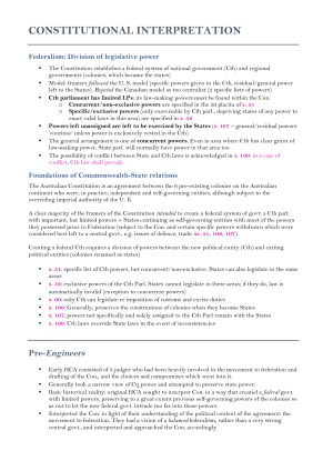These are the only Federal Constitutional Law notes you will need to understand the subject and prepare you for the exam. I have summarised and simplified the entirety of the course content, including all case law, legislation, and excerpts from the textbook written by authors/judges/commentators. The notes include all relevant material from the textbook, Moodle materials, and class notes. The notes are colour-coded (pink = legislation; green = case law; orange = commentators/authors needed for the essay; blue boxes = exam phrases/scaffolds to use) and are easy to navigate. Topic list: - Fundamentals of Australian Constitutional Law - The High Court and Constitutional Interpretation (A and B) - The High Court and Characterisation - Inconsistency between Commonwealth and State Laws - The External Affairs Power - Economic Powers (Trade and Commerce/Corporations Power) - The Races Power - The Taxation Power - The Grants Power - Express Guarantees (Trial by Jury and Freedom of Religion) - Freedom of Interstate Trade and Commerce - Implied Freedom of Political Communication - Judicial Power and Detention - The Federal Compact (Intergovernmental Immunity)
