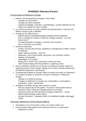 Ccomprehensive set of notes that covers the complete semester for this unit and follows the delivery of the course content over the semester. Notes have been curated from lectures attended personally, as well as practical labs and feedback from tutors and assignments. These notes enabled me to achieve a distinction grade in the course. The topics covered in these notes include: - Communication and Behaviour Change - Information Gathering for Clinical Decision-Making - Information Sources for Pharmacists - Ethical Considerations in Professional Communication - Coughs & Colds - S2/S3 Protocols - Management of Common Childhood Ailments - Pain - Eye and Ear - Health Education - Asthma - Complementary Medicines - Constipation & Diarrhoea - Obesity & Nutrition and Health & Exercise - Smoking - Adherence - Infant Nutrition - Oral Health - Ischaemic Heart Disease - Hypertension - Health Promotion - Worms, Lice and Scabies - Travel Health - Immunisation - Bacterial Skin Infections - Insomnia