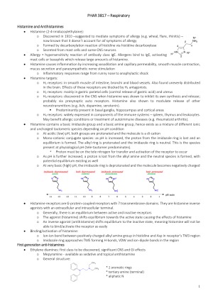 Comprehensive notes on all content in Phar3817 unit of study. Topics covered: -Histamine and Antihistamines -Allergic Rhinitis -Asthma Therapy -Inhalation Produkt Development -Herbal Medicines for Respiratory Disease -EBCM in Respiratory Disorders -Chronic Obstructive Pulmonary Disease -EBCM in URTIs -HIV/AIDS and Treatment Options -Obstructive Sleep Apnoea -Antiviral Therapy -Inhaler Technique