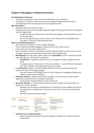 Complete, with lecture summary and textbook notes Topics: - Organisational Leadership - Management Approaches - Managing Teams - Understanding Individual Behaviour - Environment and Organisational Culture - Managing in a Global Environment - Social Responsibility and Managerial Ethics - Managers and Decision Makers - Managing Change and Innovation - Managerial Controls - Managing Operations - HR Management
