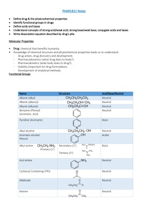 These notes include a partial portion of the PHAR1812 course and enabled me to receive a High Distinction in the course. Topics included in these notes: - Molecular Properties - Functional Groups - Acids and Bases Theories - Acid-Base Reactions - Strength - Dissociation - Quantification - Nitrogen - Sulfonamides and Sulfamates - Organic Acids/Bases - Inductive Effects - Substituent Effects on Acidity - Nitrogen Acids in Drugs - Base Strength - Alkyl Amines - Steric Effects - Pyridines - Aromatic Primary Amines - Ionisation - Hydrophilicity - Hydrogen Bonding - Ion-dipole Interactions - Salt Dissociation