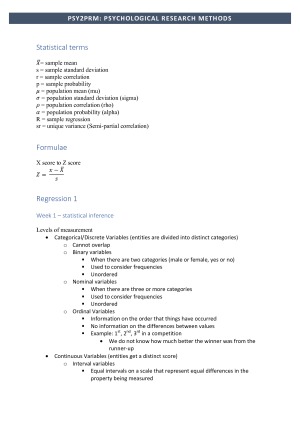 These notes contain a full summary of the material covered in lectures, tutorials, and key readings from PSY2PRM. Notes were taken during every online lecture and tutorial, and were used as my primary study tool for the exam. These notes include the following topics: - Statistical inference - Correlations - Simple Regression and Goodness of Fit - Multiple Regression - Statistical Regression - Hierarchical Regression - Categorical Predictors - Principles of Research Design - Experimental research designs - One way between-subjects ANOVA - Post-hoc pairwise comparison of means - Post-hoc setwise comparison of means - Planned comparison of means - Two way between-subjects ANOVA - Within Subjects Designs - Analysis of Covariance Hope they help you as much as they helped me!