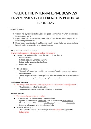Complete Monash University MGF2351 notes including relevant information for the entire course. A combination of notes from the text book, lecture slides and relevant readings. Week 1 - The international business environment - difference in political economy Week 2 - The international business environment - legal systems, economic development and transition economies Week 3 - Differences in culture Week 4 - Theories of international trade and investment Week 5 - The regulatory framework Week 6 - Foreign Direct Investment Week 7 - Cooperation among nations Week 8 - Foreign exchange and the international monetary system Week 9 - The strategy of international business Week 10 - Entry strategies for internationalising Week 11 - Globalisation and international business Week 12 - no new content