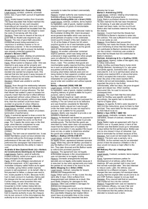 I found that this cheat sheet was my saviour in attaining a H1 for BLAW. Some people (like myself) are fooled by the first MST into thinking that BLAW is a breeze, but you will find that the second MST and the exam consist of questions which require you to draw on any of the 85 examinable cases. (I got a 60% for MST2 compared to my H1 for MST2) These notes alphabetically order all 85 examinable cases for efficient location, as well as provide the legal issues, the facts, court decision and court reasoning for each case. You will have to format the printing as 4 pages per sheet and double sided for the exam - this is not a problem for readability at all. There is also space in the 8th page to put any additional notes you may need. Note** these are the examinable cases from semester 1 2016. Some examinable cases may change.