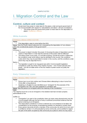 Compiled notes for the subject 'Migration, Refugees and Forced Migration' completed at Sydney University. I was the official notetaker for this subject so they are detailed and complete for each topic. The topics covered were: I. Migration Control and the Law II. Extent of the Power to Control Migration: The Constitution and Norms of International Law III. Immigration Control and the Regulatory Revolution IV. Common Entry Criteria V. Family Migration VI. Business and Skills-Based Migration VII. Refugees and HUmanitarian Migration VII. Enforcement of Migration Laws IX. The Administrative Review of Decisions on their merits X. Judicial Review The notes are separated by topic and include detail case notes in easy to understand boxes. Legislation and cases are colour coded for ease of understanding.