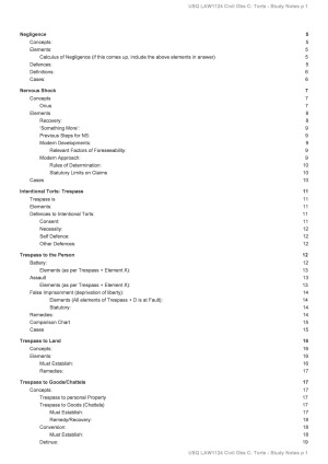 Comprehensive Exam notes with Table of Contents, Outline and attack plan formatting. Topics 1. Negligence 2. Trespass 3. Economic torts 4. Vicarious liability 5. Nuisance 6. Defamation 7. Survival of actions and dependant's claims