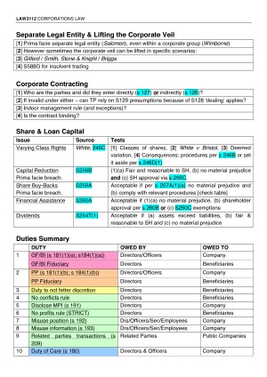 First 2 pages are a summary of the main ways to structure each issue and which legislative provisions to refer to. The bulk of the notes are detailed notes (in exam structure) for each topic. Some abbreviations used: HC - Holding company Subsid - Subsidiary company C - Company CC - Company constitution Dr - Director CSec - Company secretary GM - General meeting SR - Special resolution IMR - Indoor management rule Includes all examinable topics (2017): * Registration of companies and its effects * Kinds of companies * Directors, members and corporate decision-making * Company constitutions and replaceable rules * Corporate contracting * Share and loan capital and dividends * Corporate governance and directors' duties * Members' remedies * Corporate mortality