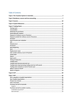 Topics 1-8 Complete course notes gathered from lectures, tutorials, study notes, textbook and other course readings Includes definitions, cases, section numbers in legislation and calculations in alphabetical order as recommended by the lecturer to easily find what you're looking for in exams