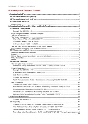 Read the textbook and all the cases to summarise them into comprehensive notes on legislation, cases and principles of Copyright and Design Law. Contains contents page with clear structure in accordance to the Unit of Study Outline. Topics include: 1. Introduction to IP 2. Introduction to Copyright: History and Basic Principles 3. Criteria for Subsistence 4. Subject Matter 5. Ownership and Exploitation 6. Infringement 7. Economic Rights: the enumerated rights 8. Authorisation of Infringement 9. Exceptions and Limitations on Copyright 10. Other rights of creators and owners 11. Remedies for infringement 12. An introduction to design law 13. The Copyright-Design Overlap