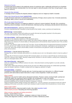Notes from whole semester. Only what is relevant. The unit is VERY discussion based. My notes are what you need to know for exam and assignments. Also includes relevant models. Topics covered: Models, Cultural Scale/Security, Racism, History, Empowerment, Equality/Equity, Gender issues, Epigenetics, Intervention Read these and pay attention in class discussion and you will be set! Good luck!