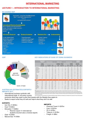 - 94 pages of in-depth notes taken in both lectures and tutorials throughout the block learning course - Includes additional slides content, lecture content, case studies, examples, diagrams from slides and information given about the assessments / final exam - Colour-coded with definitions, case studies, references and exam requirements - Easy to read, nicely formatted notes that helped me achieve a distinction in this subject TOPICS • Introduction to International Marketing • Strategic Planning and Competitive Strategy (+ Additional Slides) • Researching International Markets (+ Additional Slides) • The International Political, Economic and Legal Environments (+ Additional Slides) • The Cultural, Social and Technological Environments of International Business (+ Additional Slides) • Which Markets and International Market Selection (+ Additional Slides) • Developing Products for Overseas Markets (+ Additional Slides) • Marketing International Services • International Market Entry (+ Additional Slides) • International Logistics • International Pricing • Promotion in International Markets (+ Additional Slides) • Final Exam Workshop
