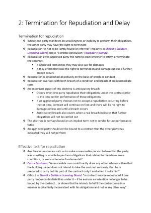 Well formatted, very comprehensive, easy to follow HD exam notes for LAW2102. Inclusive of all legislation and cases on reading guide as of semester 2 2017. Includes case summaries and issue spotting checklist. Topics covered: -Introduction and termination -Termination for repudiation and delay -Consequences of affirmation or termination (including RTT) -Damages -Liquidated damages and penalties, specific performance and injunctions -Restitution and actions for debt -Frustration -Common law vitiating factors -Common law remedy - rescission -Statutory vitiating factors -Statutory remedies -Issue spotting checklist