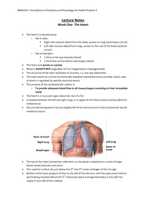 Weeks 1-11 notes for BMA1012 (including diagrams) Topics: -the heart -the blood -the respiratory system -blood and lymphatics -the endocrine system -the digestive system -the urinary (renal) system -reproduction -pregnancy and fetal development NOTE: weeks 4 and 9 are not missing. No content was covered in these weeks due to assessments.