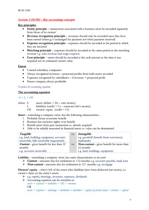 Mid-semester exam notes - content from week 1-5. Perfect for cramming!! Notes organised using learning outcomes given in lectures. I made these notes using the most important elements of my extensive notes (I compiled these throughout the semester using lecture slides, lecturer comments, all readings, homework questions and information given in tutorials). All the important information for the mid semester exam. Topics in my notes according to the week they were taught 1. Introduction to accounting 2. Key accounting concepts 3/4. Business transactions 5. Internal control