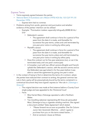 Comprehensive Contract Law notes which include bonus material that may help with assignments or further understanding. Notes have been categorised by material that is and isn't examinable. Cases have been italicized and coloured in blue. Most cases come with case summaries and commentary. Topic list: • Non-examinable material/introductory concepts • Examinable material o Privity of contract o Express terms o Discharge of contract o Discharge by unforeseen supervening event o Consequences and effects of right to terminate o Claims and remedies • Bonus material