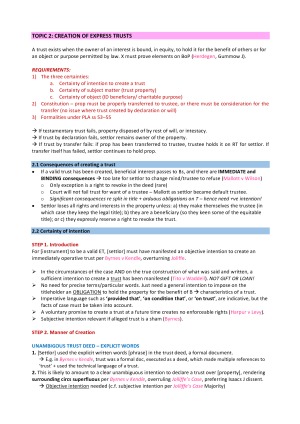 Comprehensive, well-structured step-by-step trusts exam notes, incorporating lecture materials, tutorial learnings, cases, readings, and tips learned from completing previous exam papers. Covering ALL topics for trusts exam, namely: - TOPIC 2: CREATION OF EXPRESS TRUSTS - TOPIC 3: TRUST STRUCTURES - TOPIC 4: STATUTORY WRITING FORMALITIES - TOPIC 5: CONSTITUTING THE TRUST - TOPIC 6: DUTIES AND POWERS OF TRUSTEES - TOPIC 7: DEFENCES AND LIMITATIONS ON LIABILITY - TOPIC 8: RIGHTS OF TRUSTEES - TOPIC 9: RIGHTS OF BENEFICIARIES - TOPIC 10: REMEDIES FOR BREACH OF TRUST Good luck! :)