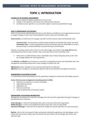 Covers Weeks 1 -12 content and all topics under the Unit Guide. Provides great exam revision and also guidance throughout the semester. Very detailed and well structured. Topics Include: - Cost terms, concepts & classifications - Cost behaviour & cost drivers - Product costing systems - Process costing systems - Overhead costs - Activity based costing - Pricing & product mix - Cost volume profit analysis - Capital expenditure decisions