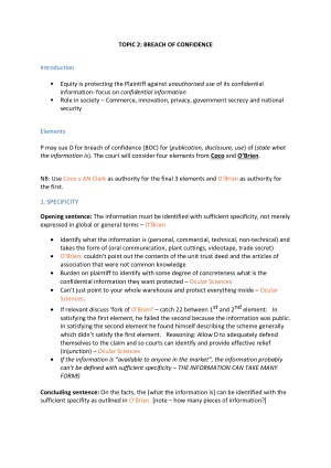 I compiled these notes in preparation for the final exam. They have all relevant cases, lecture notes, and helpful introduction sentences/paragraphs to the issues. It covers all topics in the reading guide, including: - Introduction to the topic/policy - Breach of Confidence - Breach of Fiduciary Duties - Personal Remedies - Equitable Proprietary Remedies - Assignment of Property Rights in equity