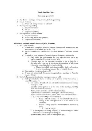 Short exam-style notes for Family Law - perfect for approaching hypotheticals and understanding all of the steps involved in post-separation arrangements. Covers all of the course (i.e., post-separation parenting arrangements, property disputes and family violence) for the 12 weeks of semester.