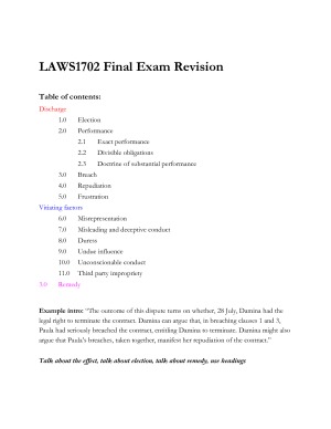 13 weeks of content covering: DISCHARGE 1.0 Election 2.0 Performance 2.1 Exact performance 2.2 Divisible obligations 2.3 Doctrine of substantial performance 3.0 Breach 4.0 Repudiation 5.0 Frustration VITIATING FACTORS 6.0 Misrepresentation 7.0 Misleading and deceptive conduct 8.0 Duress 9.0 Undue influence 10.0 Unconscionable conduct 11.0 Third party impropriety REMEDY