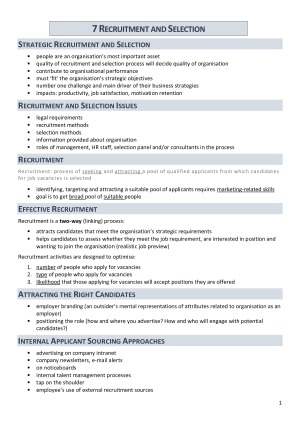 The notes cover all the core concepts necessary for the final exam. All lectures are summarised into dot points and formatted so it is easy to memorise. Topics include: 1. Introduction to HRM 2. Approaches to HRM 3. Environment of HRM 4. HR Planning and Job Analysis 7. Recruitment and Selection 8. Performance Management 9. HR Training and Development 10. Reward Management 11. Managing Workforce Diversity 12. Evaluating HRM