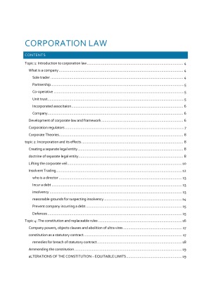 Comprehensive, well-structured step-by-step corporations law exam notes, incorporating lecture materials, tutorial learnings, cases, readings, and tips learned from completing previous exam papers. These HD Corporations Law Exam Notes cover exam topics: - TOPIC 1: INTRODUCTION - TOPIC 2: REGISTRATION AND ITS EFFECTS - TOPIC 3: TYPES OF CORPORATIONS - TOPIC 4: THE CONSTITUTION AND THE REPLACEABLE RULES - TOPIC 5: SHARE CAPITAL, LOAN CAPITAL AND DIVIDENDS - TOPIC 6: DIRECTORS, MEMBERS & CORPORATE DECISION-MAKING - TOPIC 7: CORPORATE CONTRACTING - TOPIC 8: DIRECTORS’ DUTIES - TOPICS 9: CONSEQUENCES OF BREACHES OF DIRECTORS’ DUTIES AND RELIEF FROM LIABILITY - TOPIC 10: MEMBERS’ REMEDIES - TOPIC 11: CORPORATE MORTALITY