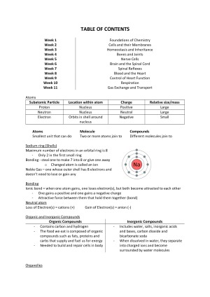 This includes 11 weeks of content from Semester 1, 2018. Topics covered include: - Foundations of Chemistry (Week 1) - Cells and their Membranes (Week 2) - Homeostasis and Inheritance (Week 3) - Bones and Joints (Week 4) - Nerve Cells (Week 5) - Brain and the Spinal Cord (Week 6) - Spinal Reflexes (Week 7) - Blood and the Heart (Week 8) - Control of Heart Function (Week 9) - Respiration (Week 10) - Gas Exchange and Transport (Week 11)