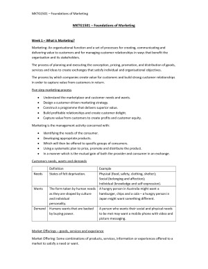 Week 1: Marketing Concepts / Marketing Plan / Teams Week 2: Creating Value and Competitive Advantage Week 3: Strategic Marketing Week 4: Consumer Behaviour Week 5: Marketing Environments and Analysis Week 6: Segmentation, Targeting and Positioning Week 7: Product and Service Strategies