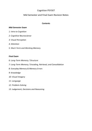 Includes notes for both the mid-semester and the final exam. Mid-semester exam covers topics 1-5 1: Intro to Cognition 2: Cognitive Neuroscience 3: Visual Perception 4: Attention 5: Short-Term and Working Memory Final Exam covers topics 6-13 6: Long-Term Memory / Structure 7: Long-Term Memory / Encoding, Retrieval, and Consolidation 8: Everyday Memory & Memory Errors 9: Knowledge 10: Visual Imagery 11: Language 12: Problem-Solving 13: Judgement, Decisions and Reasoning
