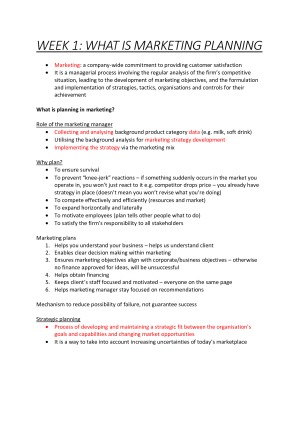 Complete Monash University MKF3121 notes including relevant information for the entire course. A combination of notes from the text book, lecture slides and relevant readings. Week 1 - Introduction to marketing planning Week 2 - Marketing in the firm context and internal analysis Week 3 - Customer analysis and segmentation Week 4 - Competitor analysis Week 5 - Industry analysis Week 6 - SWOT Week 7 - Targeting, positioning strategy and tactics Week 8 - Implementation Week 9 - Beyond functional marketing (Week 10 - No new content) Week 11 - Marketing and shareholder value (Week 12 - No new content)