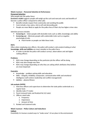 Policing: Systems and Practice study notes. Detailed enough to allow me to achieve a Distinction for the subject. Covers all the content needed for study, and the exam. -Personnel Selection -Police Culture & Subculture -Systems of Policing -Investigative Interviewing -Interrogations & False Confessions -Eyewitness Identifications - Diversity & Policing -Mental Health & Policing -Offender Profiling -The Future of Policing