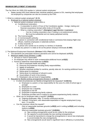 Exam notes containing summaries/structure to follow in exam. Covers: - Minimum employment standards - Employees v independent contractors - Employment contracts - Employee's implied duties - Employer's implied duties - Termination and remedies - Unfair dismissal