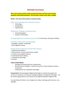My notes for INFS1602 including: - Summarised notes - Practice exam questions which are very similar to the exam and they've been answered for you - ALL WEEKS tutorial questions and answers