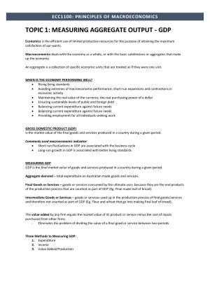 Great, detailed notes for entire semester. Topics covered include: - GDP - Inflation & Unemployment - Short run output - Fiscal Policy - Monetary Policy & RBA - Aggregate Demand/Supply - Macroeconomic Policy - Long run economy - Exchange Rates & Balance of Payments