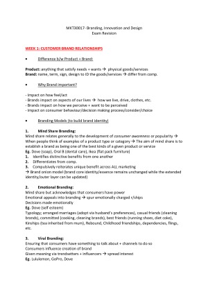 MKT30017- Branding, Innovation and Design Exam Revision Week by week revision and summarised for exam prep with examples The complete study guide for exam preparation Topic List: 1. An introduction to brand and branding models 2. Brand equity and brand positioning 3. Brand resonance 4. Designing brands part 1: Brand elements 5. Designing brands part 2: Brand experience 6. Designing brands part 3: Secondary associations 7. Measuring brand equity 8. Brand innovation 9. Managing brands part 1: Brand architecture 10. Managing brands part 2