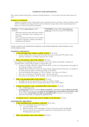 Concise and easy to follow, step-by-step evidence and proof exam notes. They made the whole weekend much easier and I finished the exam with ample time to spare! The notes contain all the legislation you need with annotations, which explain how the sections work. I have also included checklists for sections like opinion evidence etc. About me: - I am a third year law student with a high H1 average. - I have received several prizes for my academic achievements, including a scholarship for a full tuition of my law degree, for placing as one of the top 2 students during my first year at law school. - I was a STS tutor. - I have been successful in securing numerous clerkships at top tier firms. - I have a graduate job lined-up at a top tier international firm. Topics covered in the notes: 1. Case theory - Structure and factual theory 2. Proof - Types of evidence and structure of proof 3. Admissibility - - Relevance - Hearsay - Hearsay exceptions - Discretionary exclusions - Opinion evidence - Tendency and coincidence - Credibility evidence - Character evidence - Admissions