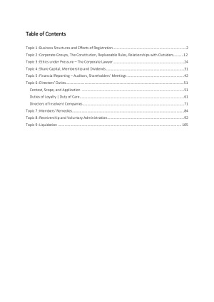 This document consists of full lecture notes - including major topics like shares and directors' duties. I've included a table of contents with all of the topics that were covered in the 2017 course (all 12 topics) to guide your reading. It was useful when it came to the revision, as I was able to condense the notes and rely on it during the exam.