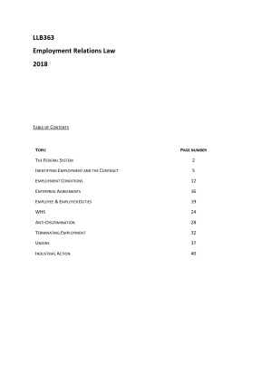 These notes build on the brief lecture notes by the addition of case law and supplementary notes from the prescribed text book. Provides a comprehensive overview of all topics covered in the semester. Relevant clauses of statute have been referenced where appropriate (as not provided in lecture material). These notes also match the unit material as updated in 2018. Topics covered: - THE FEDERAL SYSTEM - IDENTIFYING EMPLOYMENT AND THE CONTRACT - EMPLOYMENT CONDITIONS - ENTERPRISE AGREEMENTS - EMPLOYEE & EMPLOYER DUTIES - WHS - ANTI-DISCRIMINATION - TERMINATING EMPLOYMENT - UNIONS - INDUSTRIAL ACTION Includes contents page and colour coding for ease of use.
