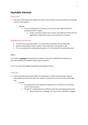 Achieved 90% for the subject. I only lost two marks in the exam. A friend of mine used my notes Semester 2, 2017 and also received a high mark - 88%. Another received 81%. My notes are comprehensive. It includes absolutely everything - including obiter in cases if a tricky question comes up. I have step-by-step guides, case summaries with diagrams and easy to follow headings. I also have a lot of "indicators" of specific factors to point you in the right direction to see, for example, whether the doctrine of specific performance is applicable. If topics overlap, I have notes to say "see also (x) page" so you can link ideas and concepts if necessary. Last but not least, there are also "exam format" and "conclusion" sub-headings so you can write a concept in a concise way for the exam and will never forget to have a conclusion! You can view this in the sample PDF above. NB. I also tutor in this subject and will be happy to help. Week 1/2 - Introduction to the Torrens System and Land Title Registration Week 2/3 - Estoppel Week 5 - Mortgages Week 6 - Easements & Profits a Pendre Week 7/8/9 - Indefeasibility week 10 - Conflicts between unregistered interests Week 11 - Co-ownership Week 12 - Co-ownership and indefeasibility Enjoy!