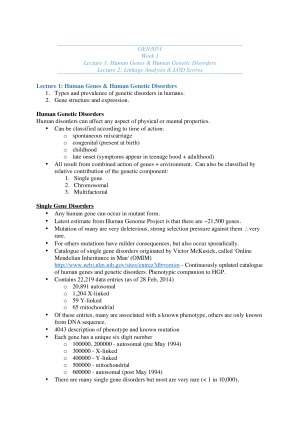 These GEN3051 notes are very detailed, organised and easy to follow! They are organised according to weeks and lectures with clear titles, headings and many examples and diagrams included throughout. These notes are perfect for test revision and especially exam revision. The unit has a lot of content packed into each lecture, however, these notes break the content up ensuring all topics are easy to read, follow and understand. Topics covered include: - Genetic disorders - Segregation and linkage analysis – single gene diseases - Identifying human disease genes - Gene discovery and diagnostics by high throughput sequencing - Human mutation and mol. pathology - Animal models in human genetics - Advances in genetic screening - Genetic treatment of disease - Stem cells - Complex disease gene identification - Genetic basis of antibiotic resistance - Cystic Fibrosis - Bacteriophage genetics - CRISPR technologies - Epigenetics and disease - Forensic genetics - Forensic genetics - applications