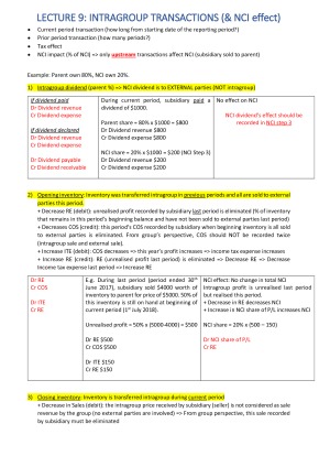 I got a mark of 96 for IFA2 in Semester 1 2018. This note contains a summary of lecture notes, textbook readings, difficult problems from tutorial preparation/in-class questions & practice exams (since it is always better to prepare for the unexpected). I used tables and diagrams to make it easier for you to see the big picture of each topic. For exam purposes, I combined some topics and summarized them together to look like exam formats. I also tried to put as many explanations as possible to help you understand IFA2 back-to-forth. Specifically for "Consolidation" - one of the hardest topics in IFA2, I have made an outline of what steps you should follow, what each entry means and what items you need to tick off for each step. I hope that this will help you score an H1 (probably even higher than 96) and you will enjoy IFA2 as much as I did. Best of luck with your study! ********************************************************** Topics covered include: 1) Reporting obligations & Conceptual Framework 2) Fair Value Measurement 3) PPE & Asset Impairment 4) Tax 5) Lease 6) Revenue 7) Financial Instruments 8-9-10) Consolidation 11) Investment in Associate 12) Disclosure issues