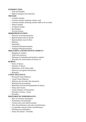 Extremely detailed and extensive notes on Contract Law. Using these notes I achieved a Distinction. Topics Include: - Introduction to Contract Law B - Mistake - Misrepresentation - Misleading and Deceptive Conduct - Duress - Undue Influence - Discharge by Performance - Discharge by Breach - Damages - Causation - Case Summaries