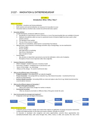 These notes include lecture slides as well as additional information from the textbook. Topics include: 1. Introduction 2. Product Innovation vs. Service Innovation 3. Organising and Managing Innovation 4. Open Innovation and Crowd Sourcing 5. User Innovation and User Entrepreneurship 6. Social Innovation and Social Entrepreneurship 7. Business Model Innovation and Value Capture 8. Entrepreneurial Assets and Resources, Pitching & Financing