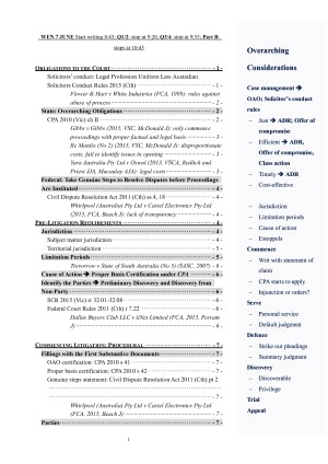 Notes consisting of - pp 1-50: rule notes following the steps in civil proceedings (with table of contents) - pp 51-67: through case notes (with table of contents) Rule Notes: concise and step-by-step response to exam questions covering (1) definitions, (2) cases, (3) statutory and disciplinary rules, and (4) prescribed readings including Banford and subject material (both of which I read throughout and made thorough notes) in the following topics: - Obligations to the court - Pre-litigation requirements - Commencing litigation: procedural - Commencing litigation: substantive - Court-annexed ADR - Costs - Class actions - Case management - Pre-trial termination of proceedings - Gathering evidence - Appeal - Enforcement of judgment Useful in hypos as well as essay questions, in terms of both issue spotting and response. Fully indexed with bookmarks, therefore easy to navigate from pre-litigation to post-trial stages. Reference is made to Case Notes (in pp 51-67) where more thorough reading of the prescribed cases is provided. Case Notes: with necessary statement of facts, one-liner summary of case significance, and precise reference to paragraph numbers and rule sections covering the following themes: - Overarching obligations - Genuine steps to resolve a dispute - Preliminary discovery - Estoppel - Pleadings - Injunctions - Costs and Calderbank letters - Class action - Case management - Summary judgment Combination of the two Notes gave me H1 in the 2017 Dispute Resolution (LAWS50027, predecessor of Disputes and Ethics, LAWS90140)) exam. [NB: the Exam Notes I am listing for Disputes and Ethics is the same as here]