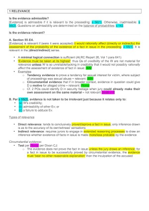 Includes a structure for each topic, and very brief case summaries per topic where needed. This is all I really needed for the exam, without needing to refer to a longer version of notes. Includes entire syllabus. TOPICS: 1. Relevance 2. Competence & Compellability 3. Privilege - Self-incrimination - Client legal privilege - Settlement negotiations - Confidential communications re: sexual offences - Evidence excluded in the public interest 4. Examination of witnesses - Examination in chief - Refreshing memory - Prior consistent statements - Unfavourable witnesses - Cross-examination - Re-examination 5. Character and credibility - Credibility - In sexual offence cases - Character of defendant 6. Accused's right to silence 7. Tendency & coincidence 8. Hearsay (and exceptions) 9. Admissions - Incriminating conduct (implied admissions) - Recording requirements - Reliability requirements (ss 84-85) - Unfairness discretion (s 90) 10. Illegally obtained evidence 11. Opinion evidence HIGHLIGHT: Blue - legislative citation Green/Pink - case law citations Yellow - key points