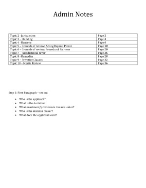 These are the notes that I created for my Admin Exam in Semester 1 2018. They cover all the topics that we did in our course: - Jurisdiction - Standing - Reasons - Grounds of review: Acting Beyond Power - Ground of review: Procedural Fairness - Jurisdictional Error - Remedies - Privative Clauses - Merits Review I hope that you find them helpful!