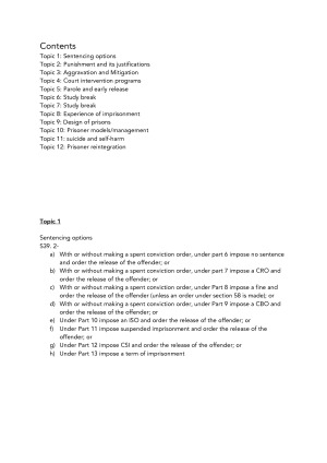 Topics covered: - Sentencing options - Punishment and its justifications - Aggravation and Mitigation - Court intervention programs - Parole and early release - Experience of imprisonment - Design of prisons - Prisoner models/management - Suicide and self-harm - Prisoner Reintegration