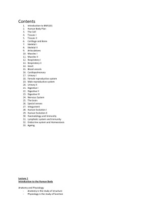 Contents 1. Introduction to BMS101 2. Human Body Plan 3. The Cell 4. Tissues I 5. Tissues II 6. Cartilage and Bone 7. Skeletal I 8. Skeletal II 9. Articulations 10. Muscles I 11. Muscles II 12. Respiratory I 13. Respiratory II 14. Heart 15. Blood vessels 16. Cardiopulmonary 17. Urinary I 18. Female reproductive system 19. Male reproductive system 20. Urinary II 21. Digestive I 22. Digestive II 23. Digestive III 24. Nervous System 25. The brain 26. Special Senses 27. Integument 28. Human Evolution I 29. Human Evolution II 30. Haematology and Immunity 31. Lymphatic system and Immunity 32. Endocrine system and Homeostasis 33. Ageing