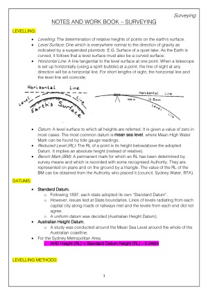Attached are comprehensive surveying notes for the subject '16138 - Site Establishment', detailing all topics in the lectures. These notes are helpful study material for this subject as it contains relevant cases that further explain the content. It is recommended to read this in conjunction with 'Site Establishment Management - Detailed HD Notes'. Topics: - Levelling Terminology - Levelling Methods and Types of Levels - Surveying Methods - Detailed steps for completing via rise and fall method.