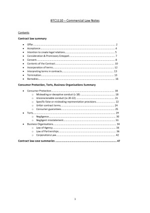 Comprehensive notes for BTC1110. I received a HD (90%) using these notes. There is a topic list in the sample notes. It contains detailed explanations of each topic, definitions, cases and examples. And it is useful to grasp a greater understanding. Within the notes, there is a case summary for all contract related cases. It is set out using dot points, headings and sub-headings and is very easy to follow and understand. It is also formatted with cases in red, and important words in blue.